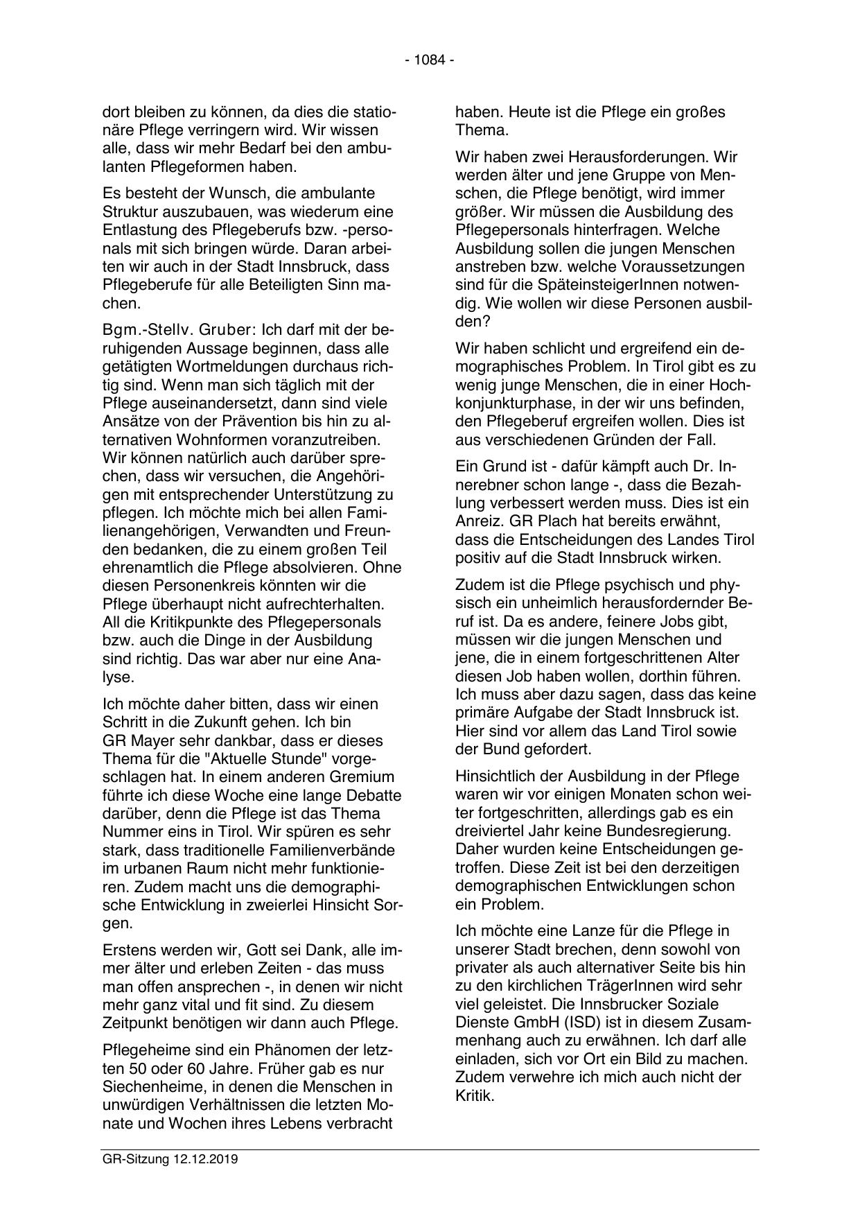Entlastung des Pflegeberufs bzw. -personals mit sich bringen würde. Daran arbeiten wir auch in der Stadt Innsbruck, dass