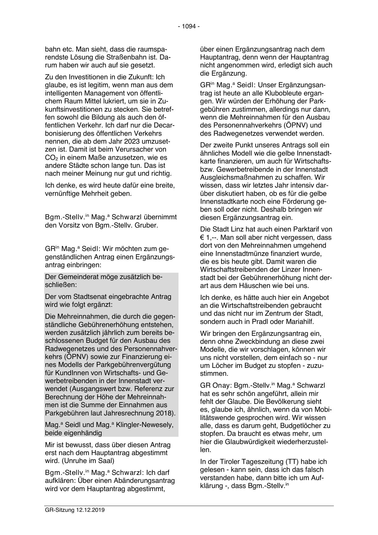 GRin Mag.a Seidl: Unser Ergänzungsantrag ist heute an alle Klubobleute ergangen. Wir würden der Erhöhung der Parkgebühren zustimmen, allerdings nur dann,