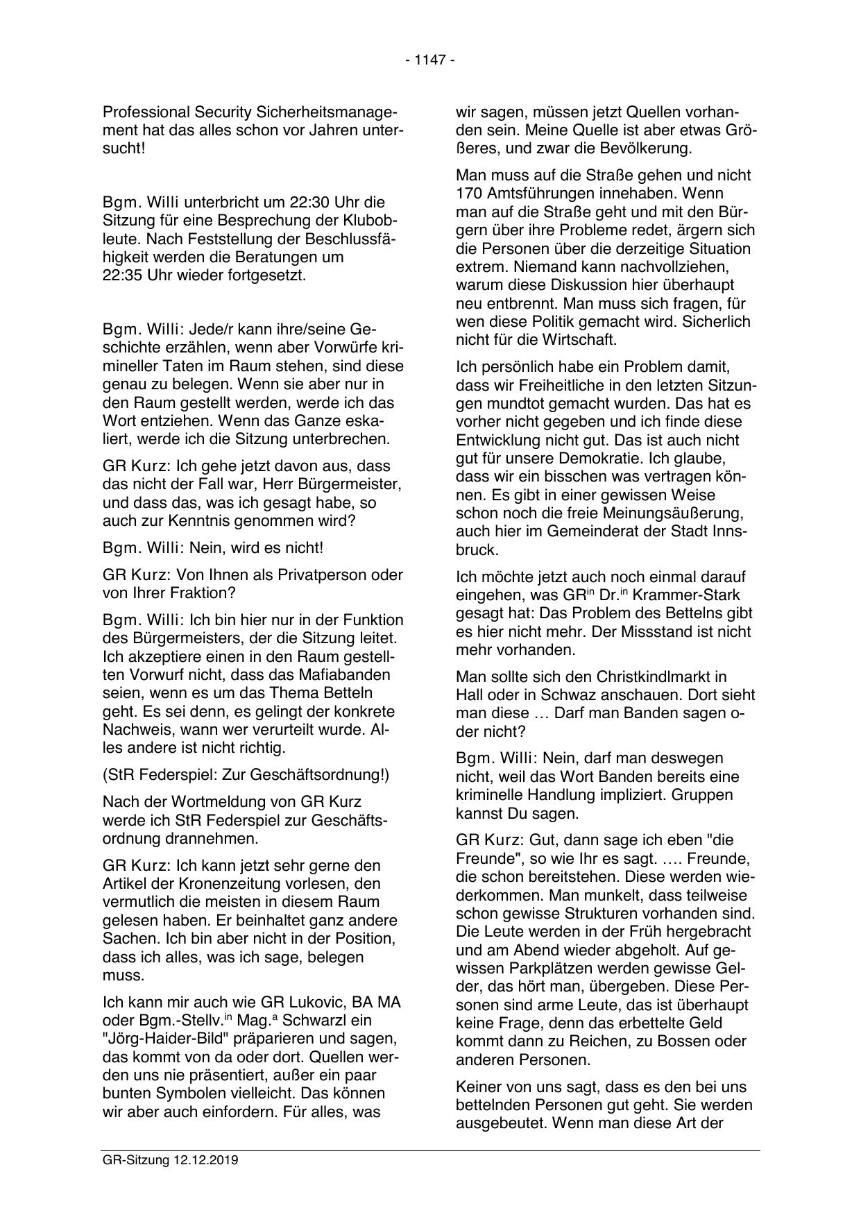 Bgm. Willi unterbricht um 22:30 Uhr die