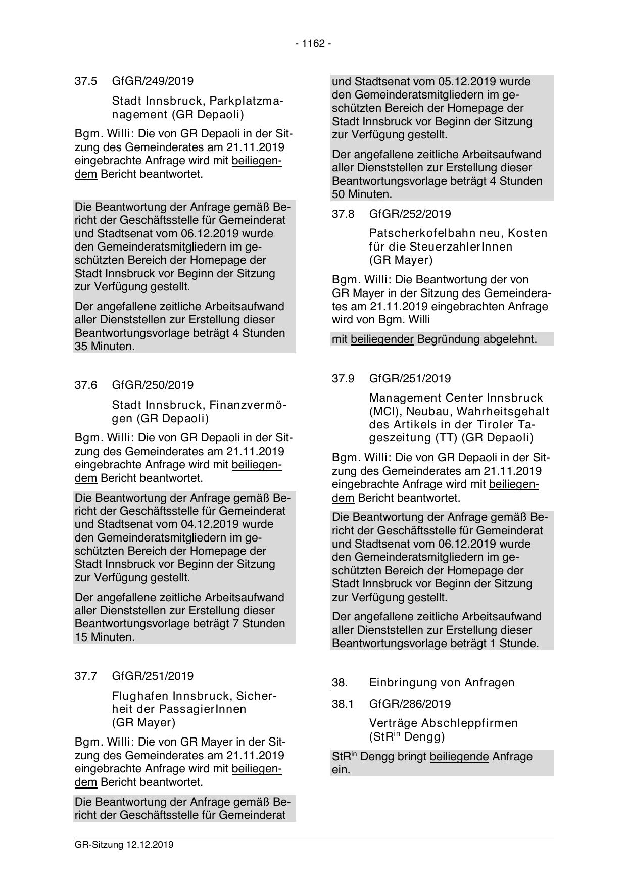 Bgm. Willi: Die von GR Depaoli in der Sitzung des Gemeinderates am 21.11.2019
