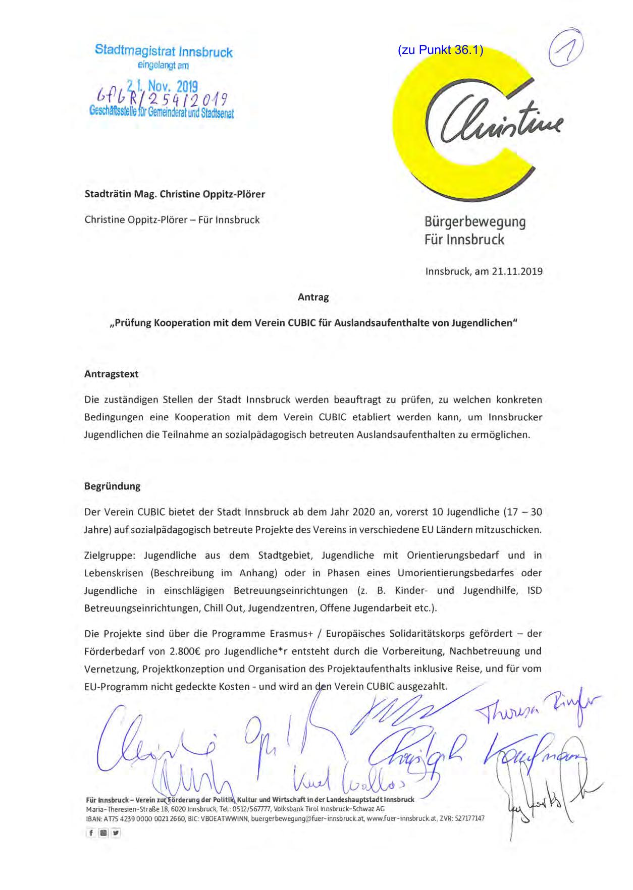Der Verein CUBIC bietet der Stadt Innsbruck ab dem Jahr 2020 an, vorerst 10 Jugendliche (17 - 30
