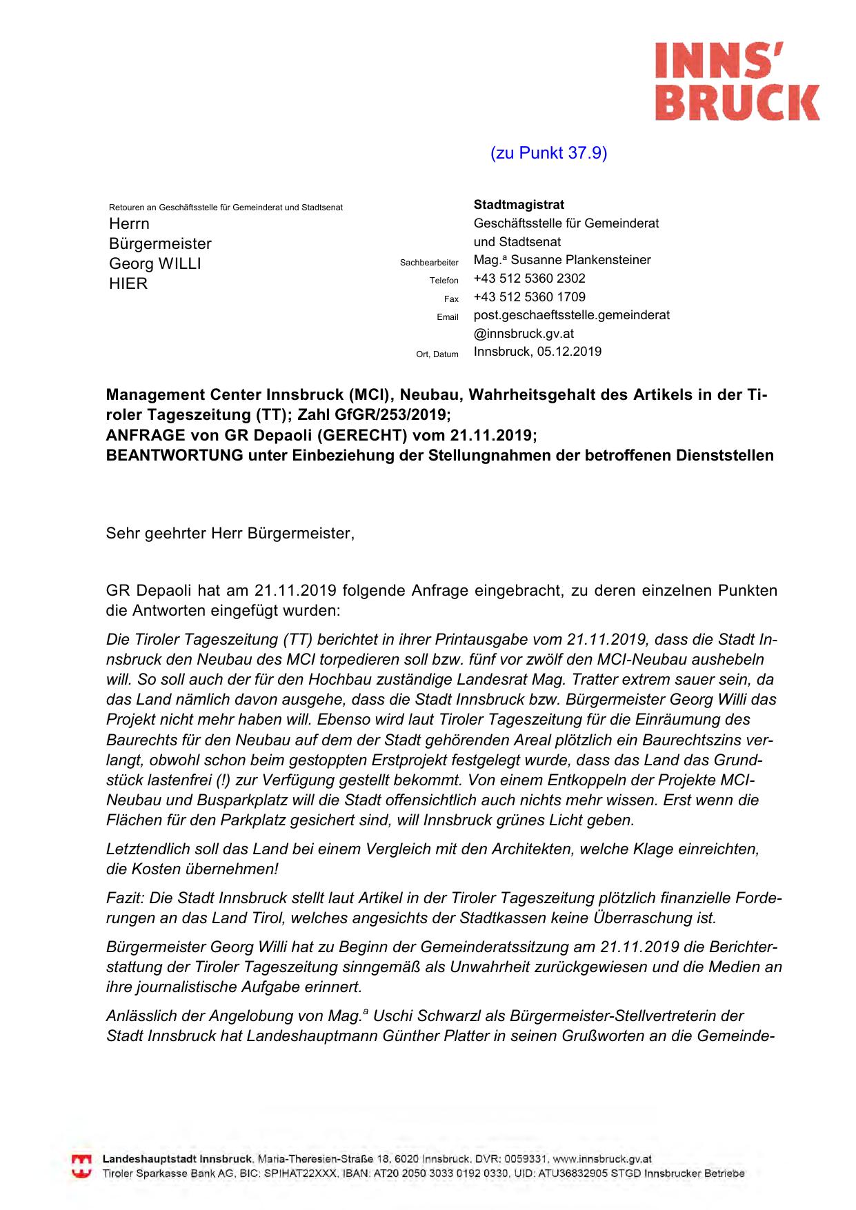 Management Center Innsbruck (MCI), Neubau, Wahrheitsgehalt des Artikels in der Tiroler Tageszeitung (TT); Zahl GfGR/253/2019;