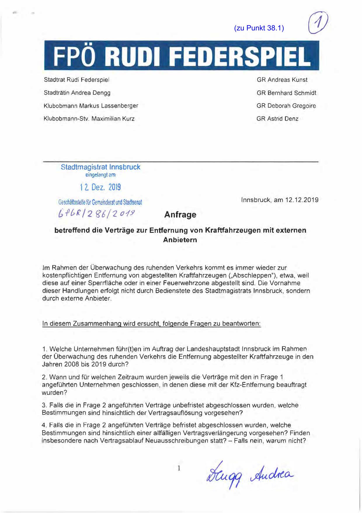 1. Welche Unternehmen führ(t)en im Auftrag der Landeshauptstadt Innsbruck im Rahmen