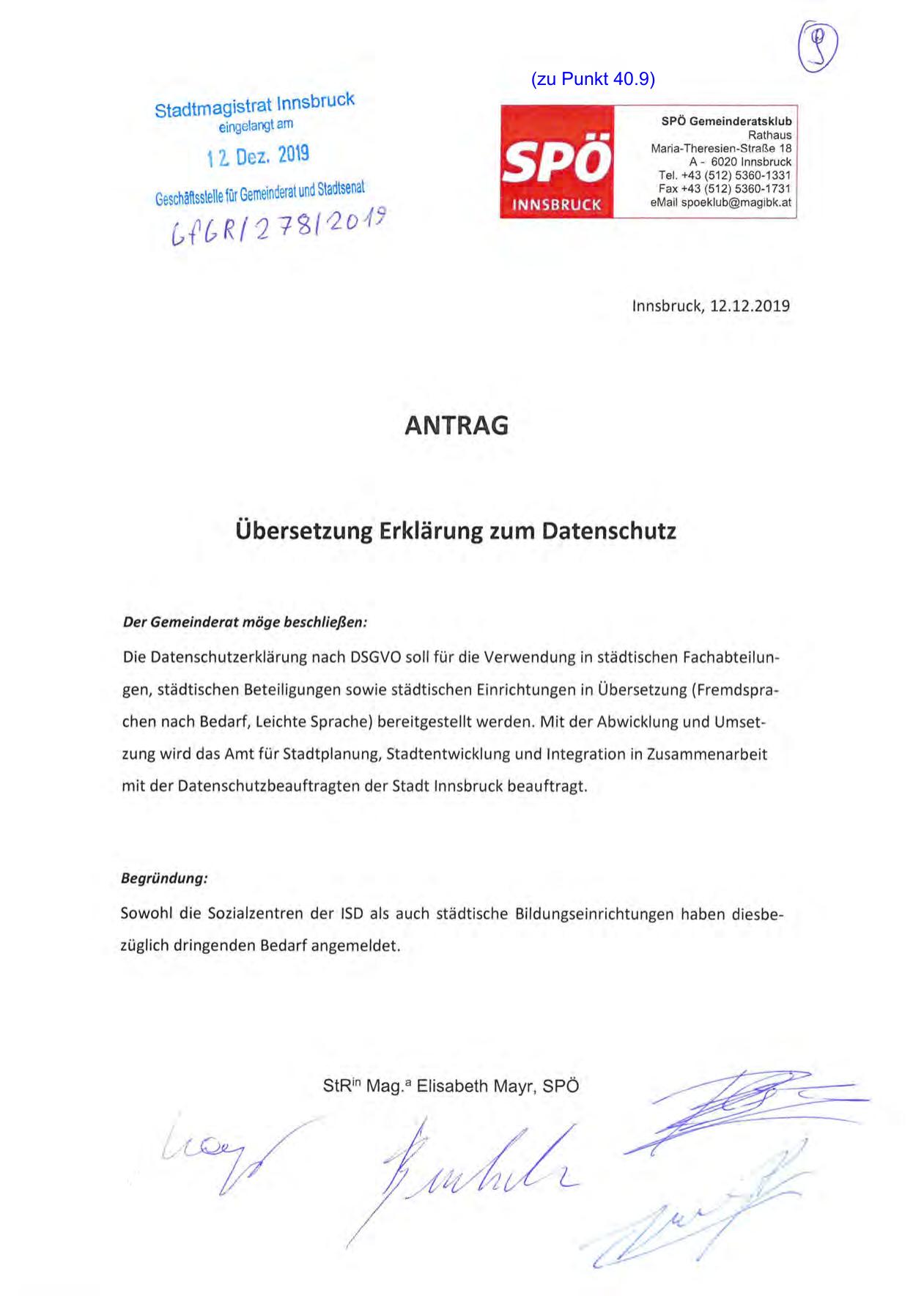 mit der Datenschutzbeauftragten der Stadt Innsbruck beauftragt.