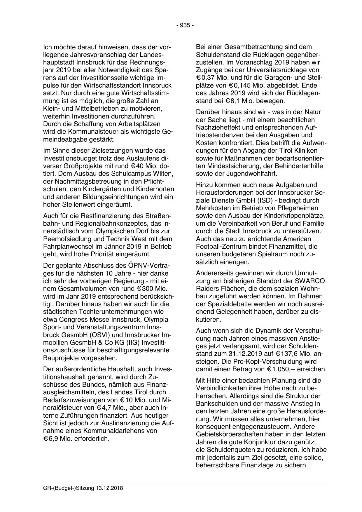 Ich möchte darauf hinweisen, dass der vorliegende Jahresvoranschlag der Landeshauptstadt Innsbruck für das Rechnungsjahr 2019 bei aller Notwendigkeit des Sparens auf der Investitionsseite wichtige Impulse für den Wirtschaftsstandort Innsbruck