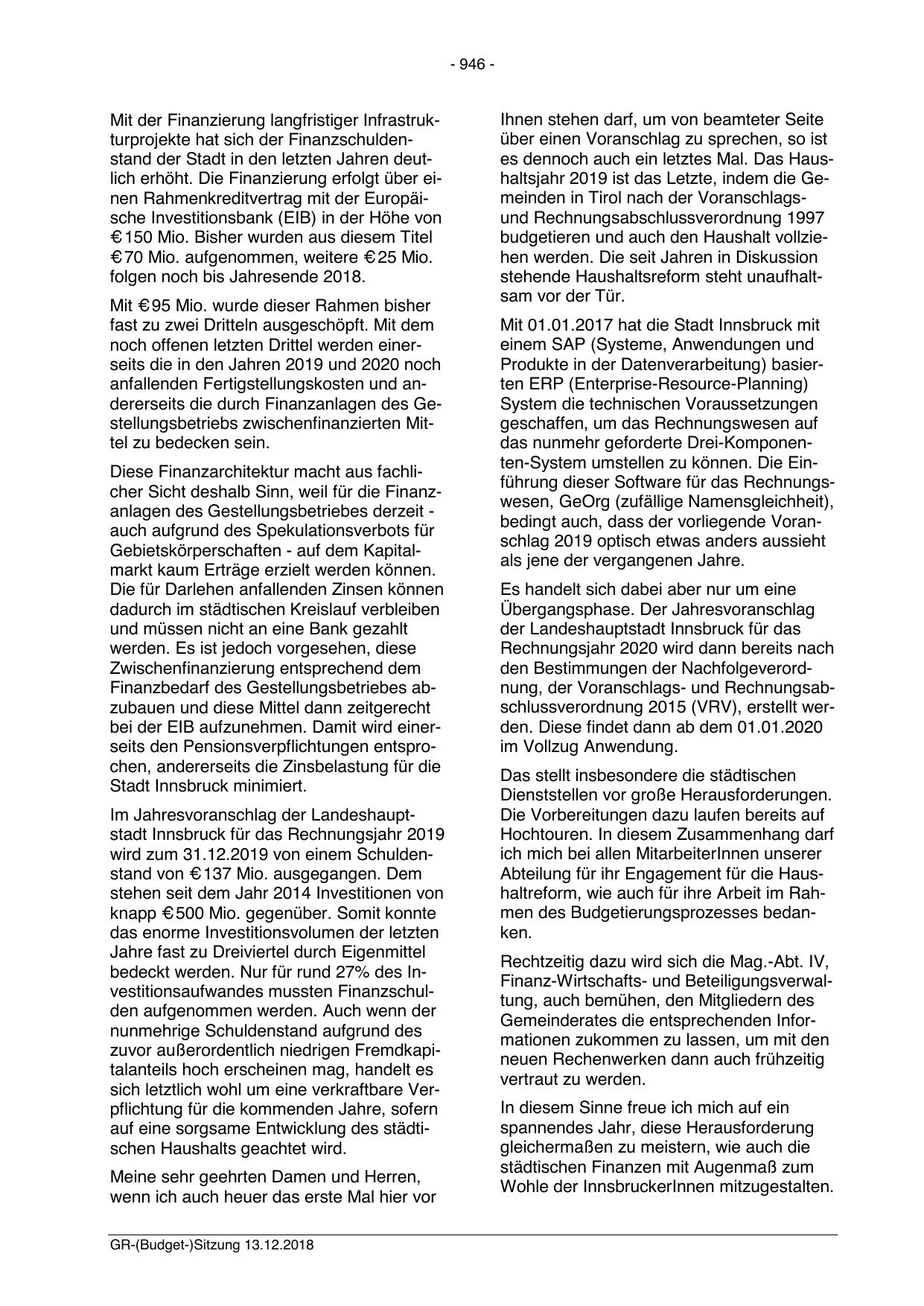 Im Jahresvoranschlag der Landeshauptstadt Innsbruck für das Rechnungsjahr 2019