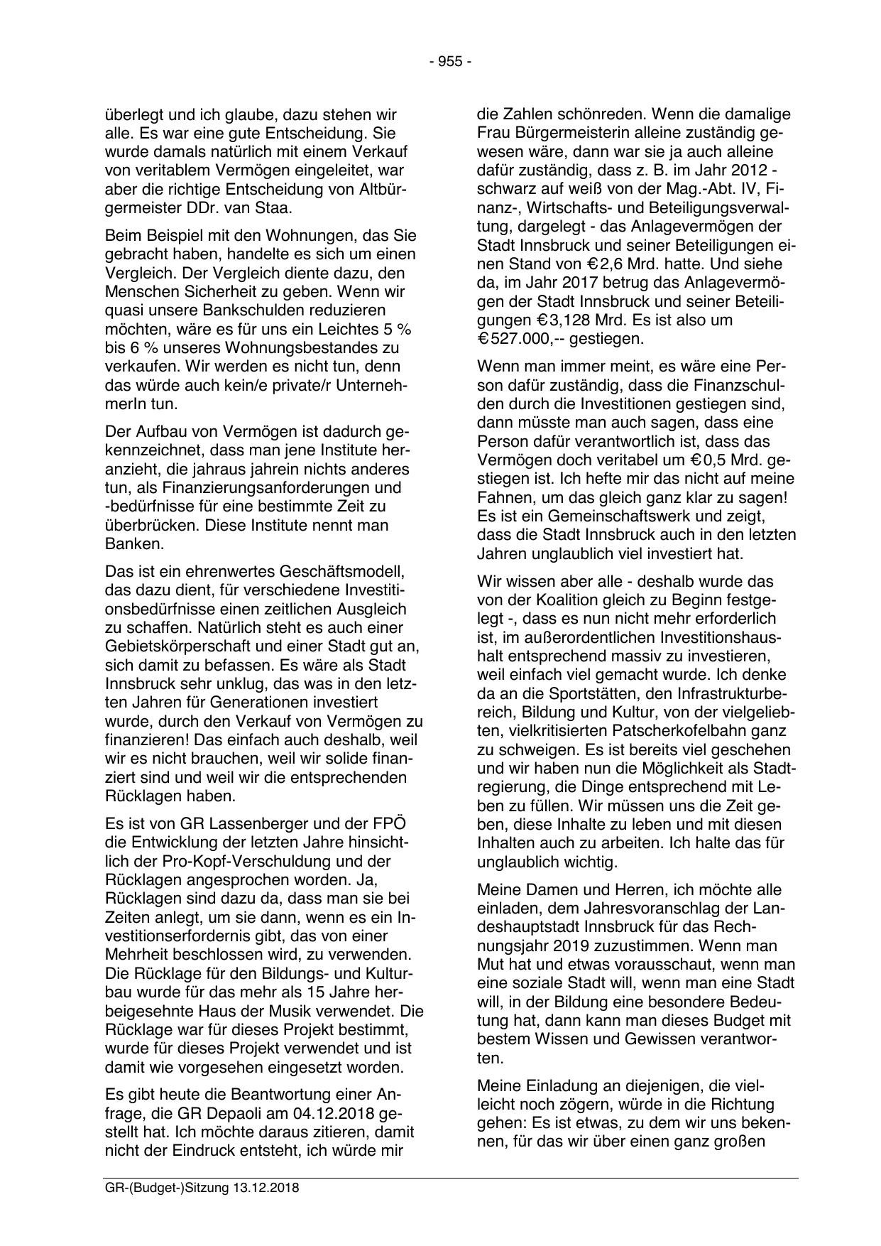 einladen, dem Jahresvoranschlag der Landeshauptstadt Innsbruck für das Rechnungsjahr 2019 zuzustimmen. Wenn man