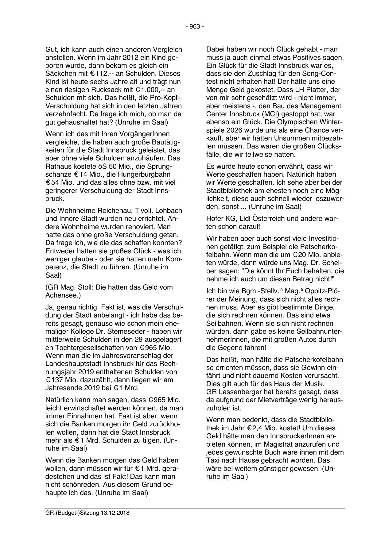 Landeshauptstadt Innsbruck für das Rechnungsjahr 2019 enthaltenen Schulden von