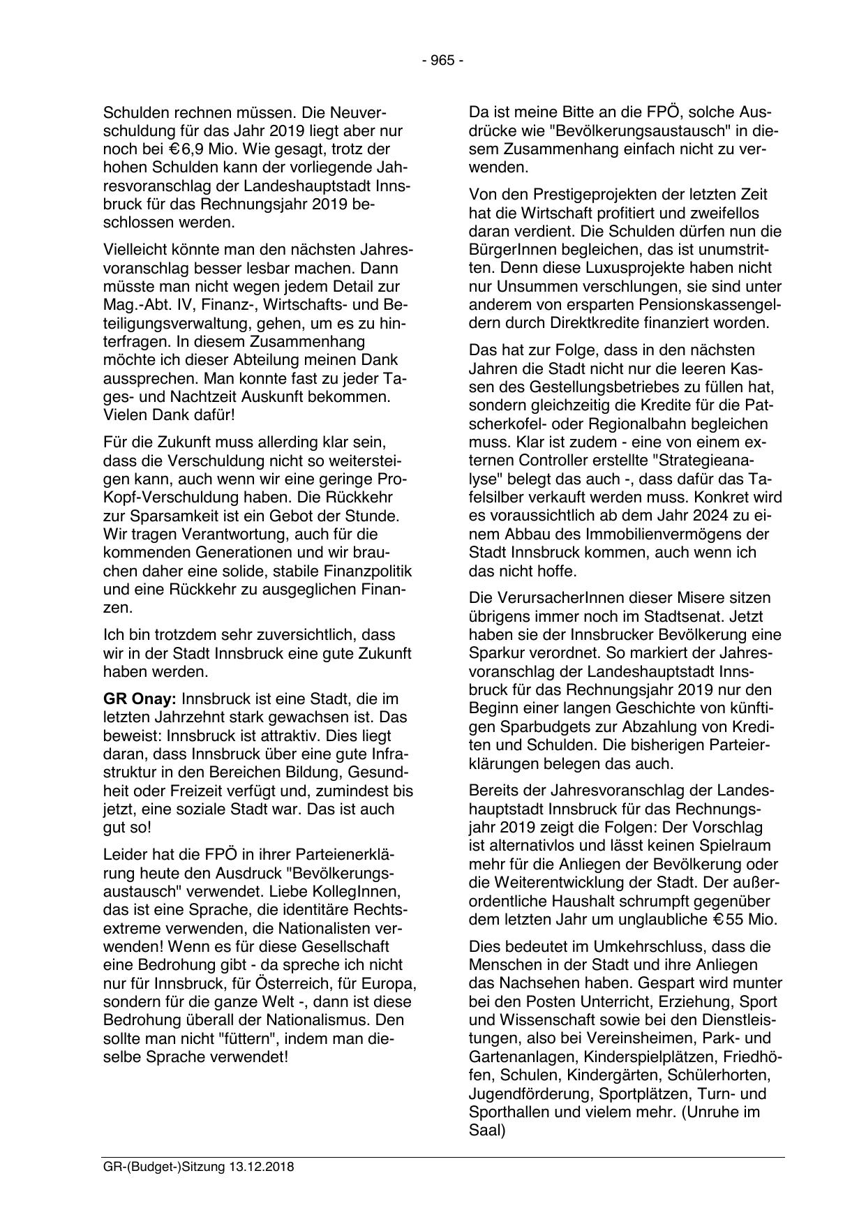 hohen Schulden kann der vorliegende Jahresvoranschlag der Landeshauptstadt Innsbruck für das Rechnungsjahr 2019 beschlossen werden.