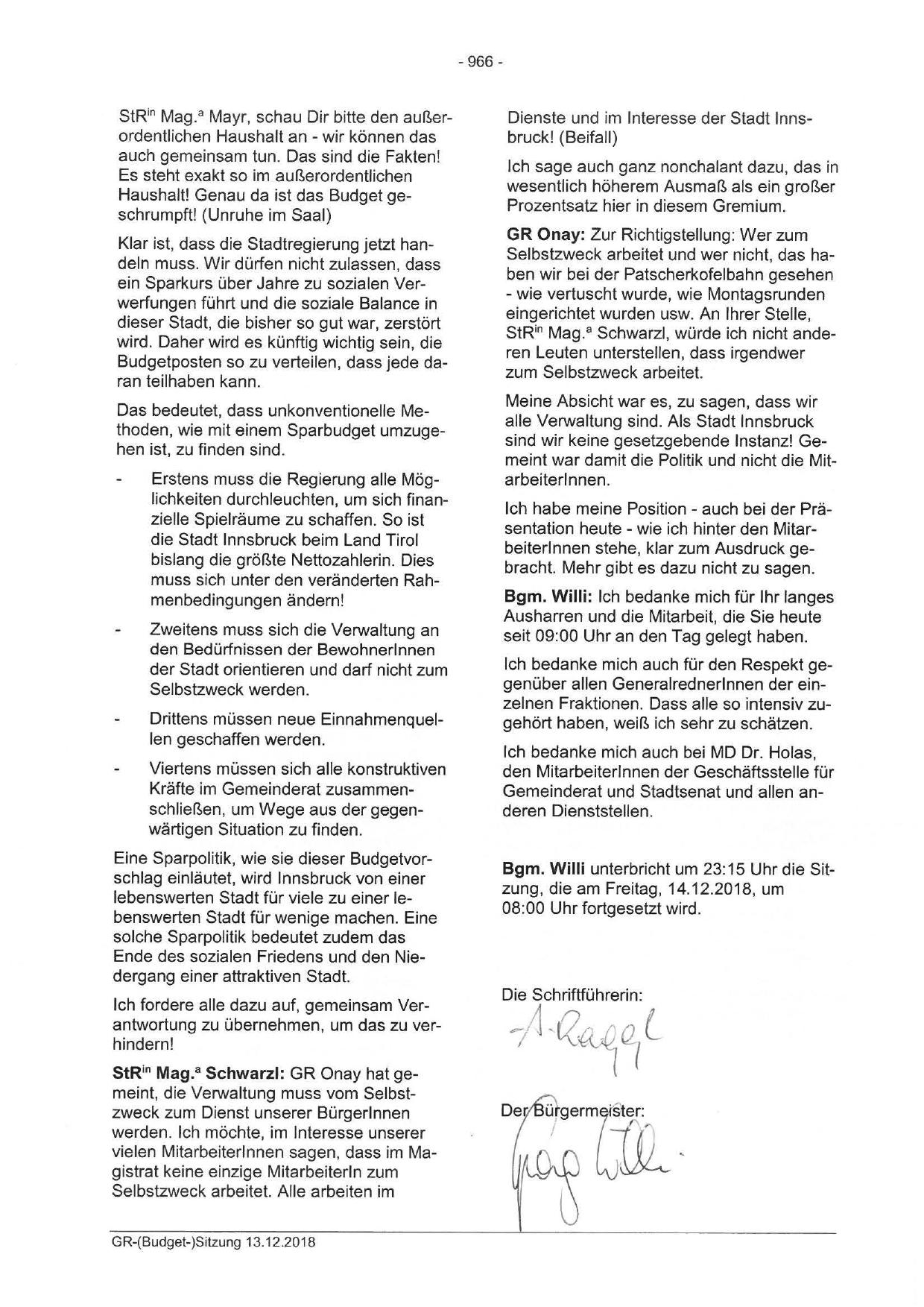 Bgm. Willi unterbricht um 23:15 Uhr die Sitzung, die am Freitag, 14.12.2018, um