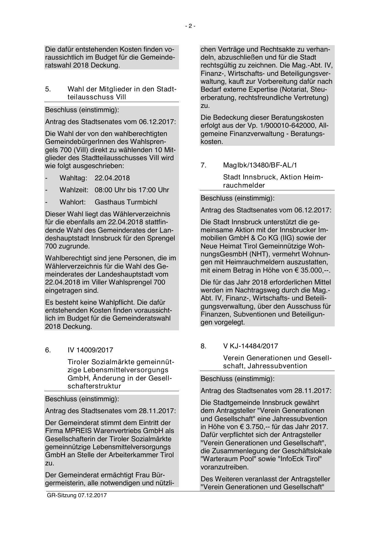 Der Gemeinderat ermächtigt Frau Bürgermeisterin, alle notwendigen und nützliGR-Sitzung 07.12.2017