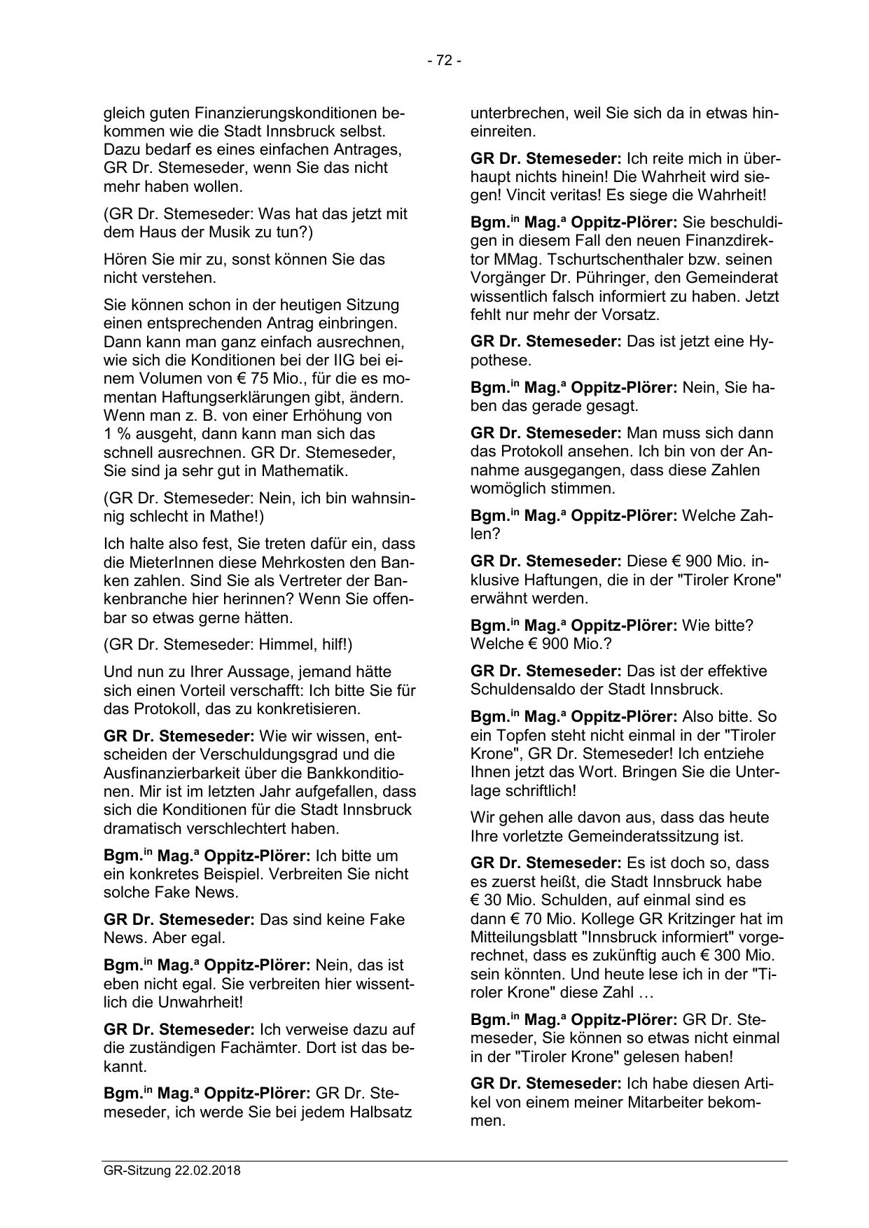 Bgm.in Mag.a Oppitz-Plörer: GR Dr. Stemeseder, ich werde Sie bei jedem Halbsatz