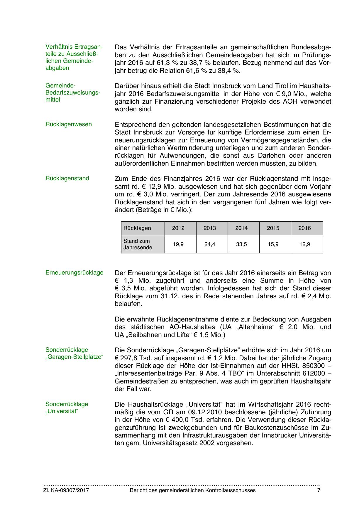Stadt Innsbruck zur Vorsorge für künftige Erfordernisse zum einen Erneuerungsrücklagen zur Erneuerung von Vermögensgegenständen, die