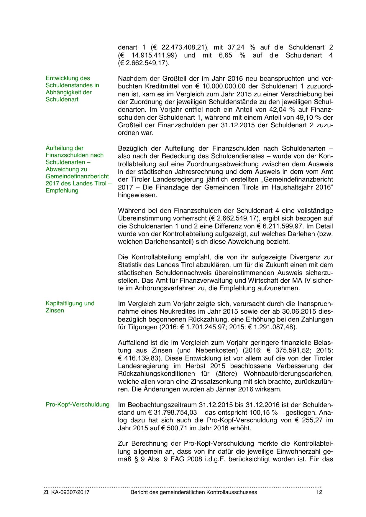 städtischen Schuldennachweis übereinstimmenden Ausweis sicherzustellen. Das Amt für Finanzverwaltung und Wirtschaft der MA IV sicherte im Anhörungsverfahren zu, die Empfehlung aufzunehmen.