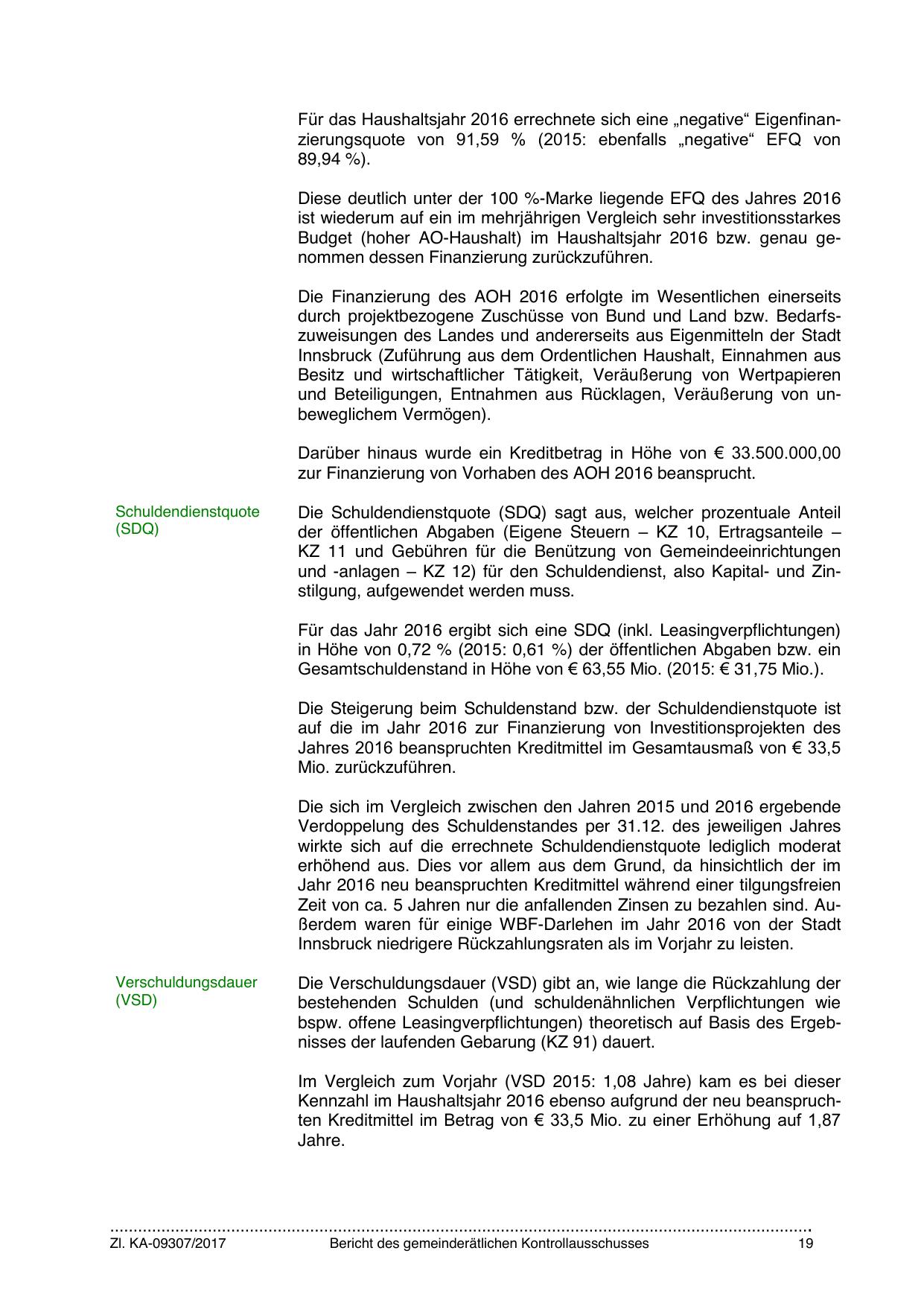 Für das Haushaltsjahr 2016 errechnete sich eine „negative“ Eigenfinanzierungsquote von 91,59 % (2015: ebenfalls „negative“ EFQ von