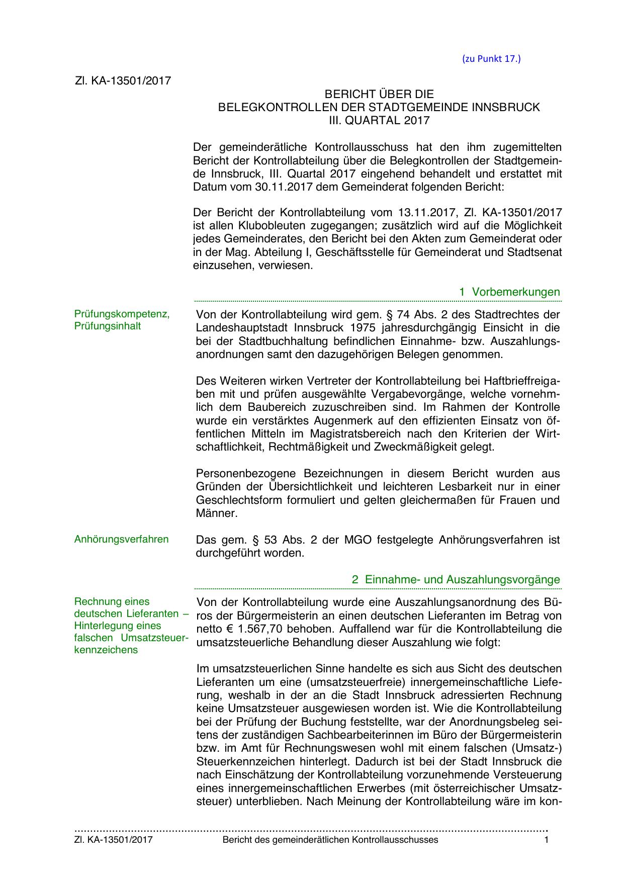 Bericht der Kontrollabteilung über die Belegkontrollen der Stadtgemeinde Innsbruck, III. Quartal 2017 eingehend behandelt und erstattet mit