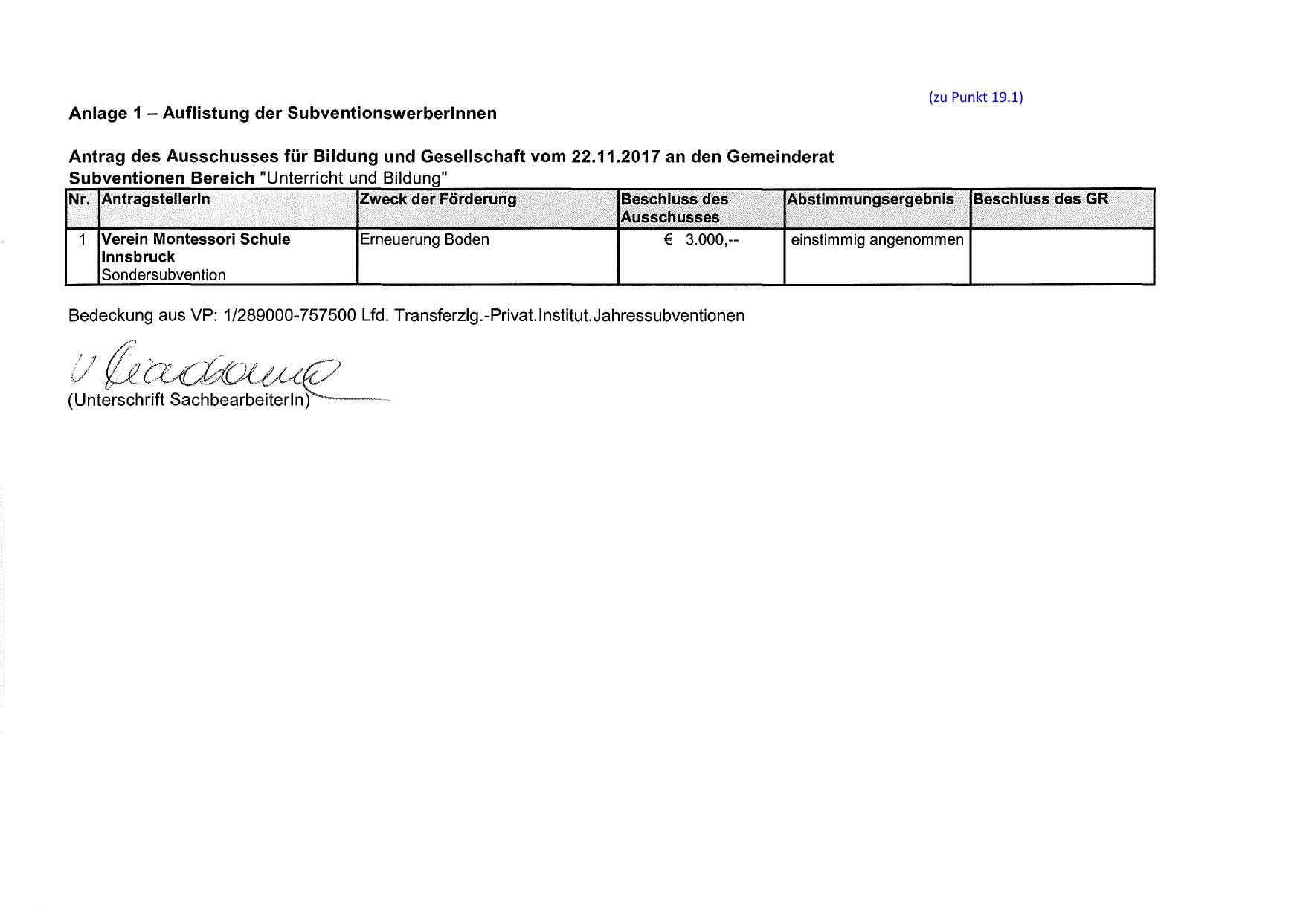 Bedeckung aus VP: 1/289000-757500 Ud. Transferzlg.-PrivatlnstitutJahressubventionen