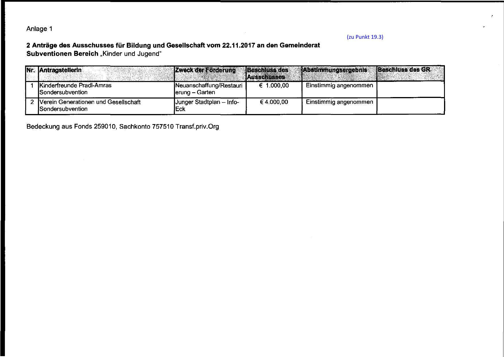 2 Anträge des Ausschusses für Bildung und Gesellschaft vom 22.11.2017 an den Gemeinderat