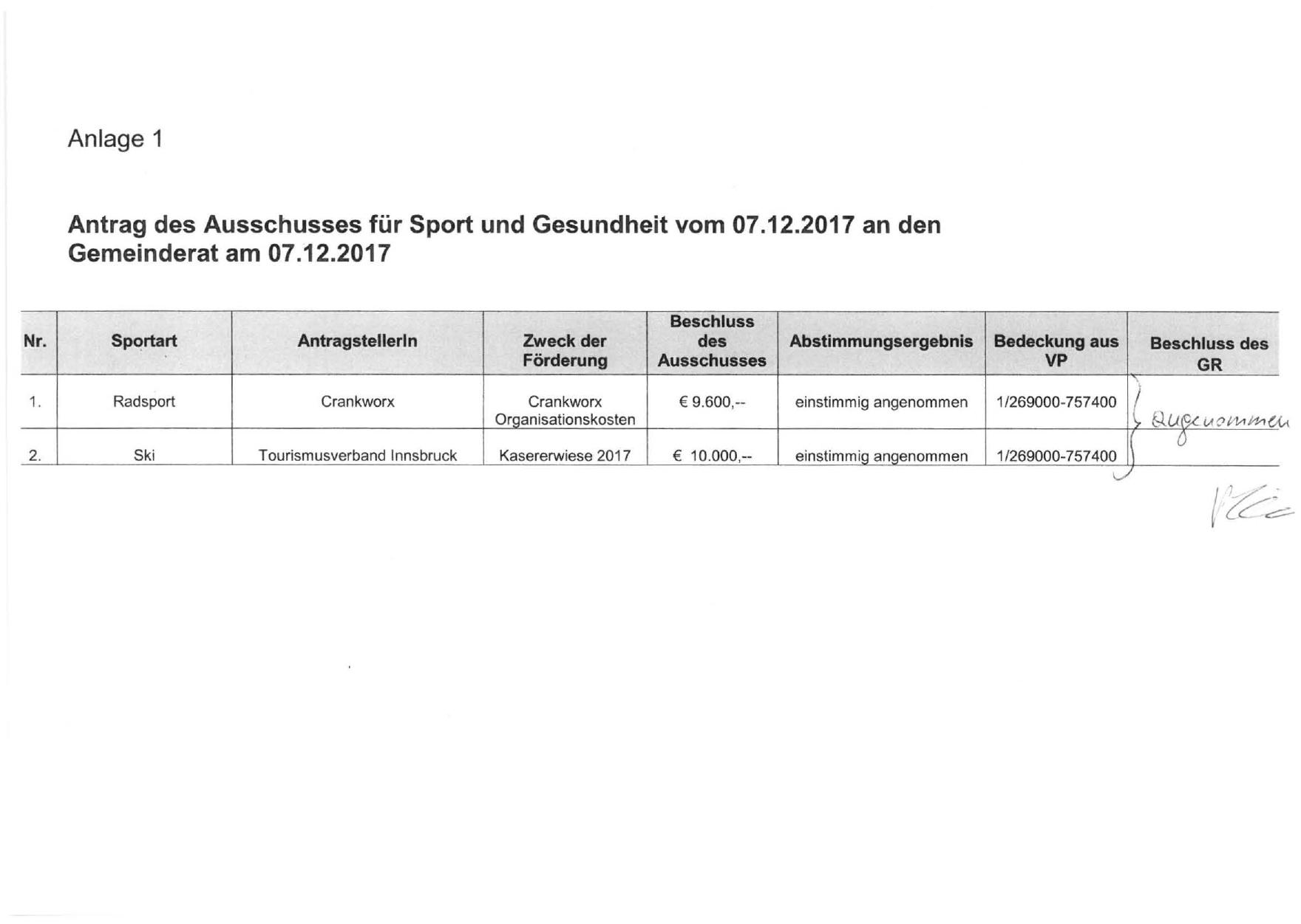Antrag des Ausschusses für Sport und Gesundheit vom 07.12.2017 an den