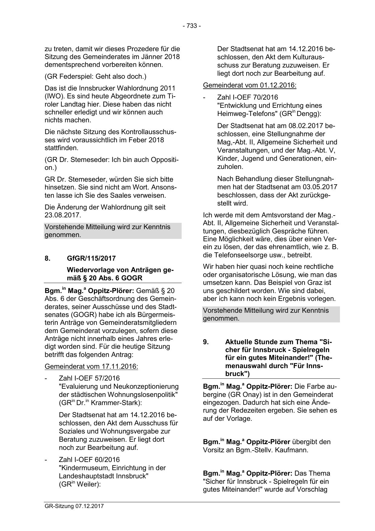 Abs. 6 der Geschäftsordnung des Gemeinderates, seiner Ausschüsse und des Stadtsenates (GOGR) habe ich als Bürgermeisterin Anträge von Gemeinderatsmitgliedern