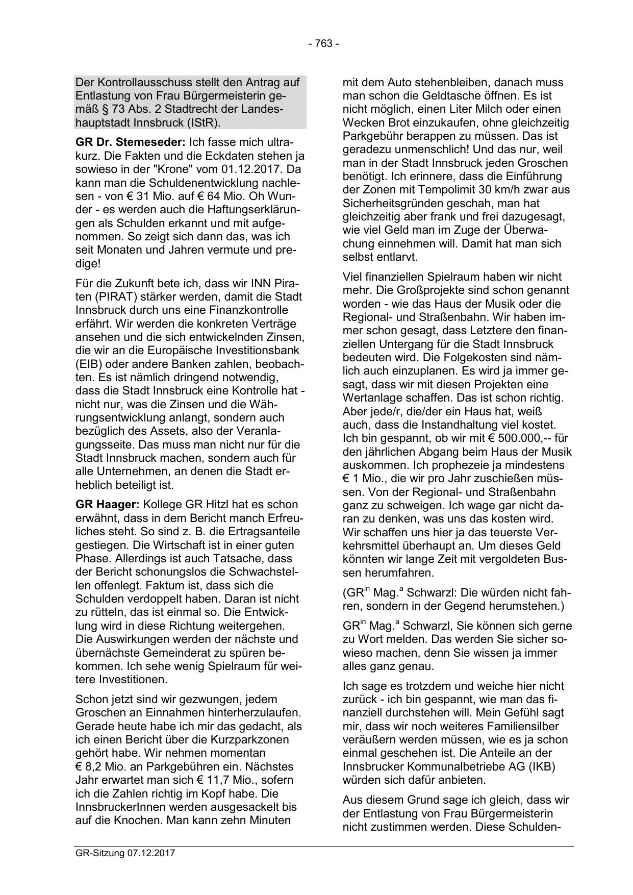 Entlastung von Frau Bürgermeisterin gemäß § 73 Abs. 2 Stadtrecht der Landeshauptstadt Innsbruck (IStR).