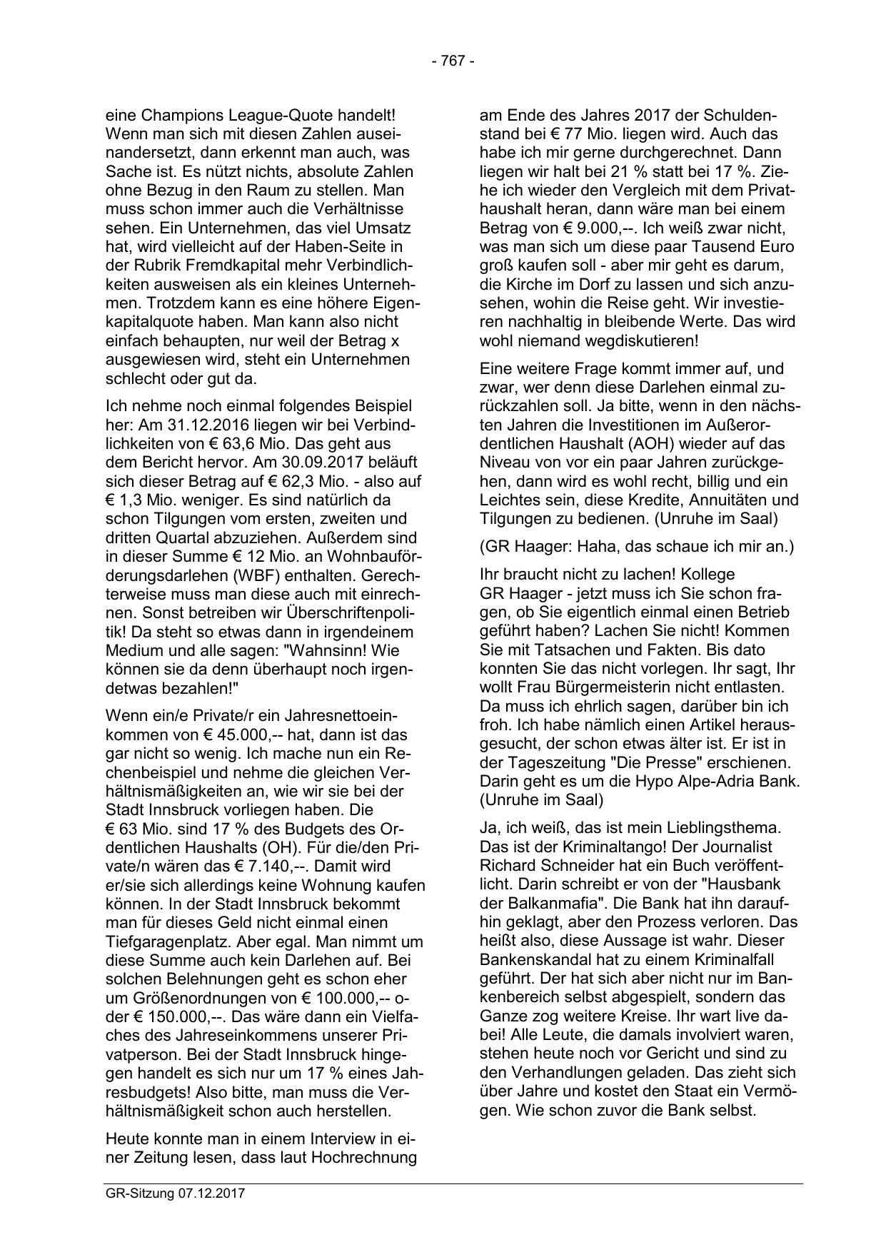 um Größenordnungen von € 100.000,-- oder € 150.000,--. Das wäre dann ein Vielfaches des Jahreseinkommens unserer Privatperson. Bei der Stadt Innsbruck hingegen handelt es sich nur um 17 % eines Jahresbudgets! Also bitte, man muss die Verhältnismäßigkeit schon auch herstellen.