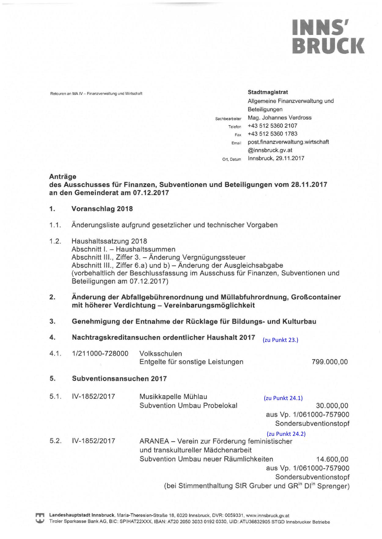 des Ausschusses für Finanzen, Subventionen und Beteiligungen vom 28,11.2017