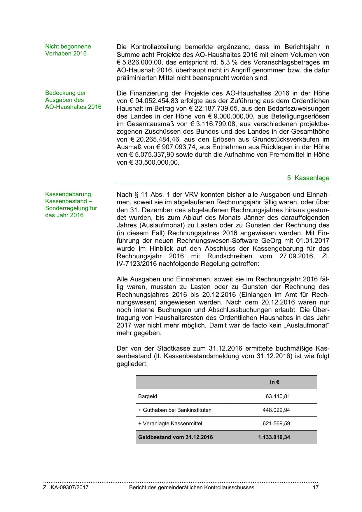 Der von der Stadtkasse zum 31.12.2016 ermittelte buchmäßige Kassenbestand (lt. Kassenbestandsmeldung vom 31.12.2016) ist wie folgt