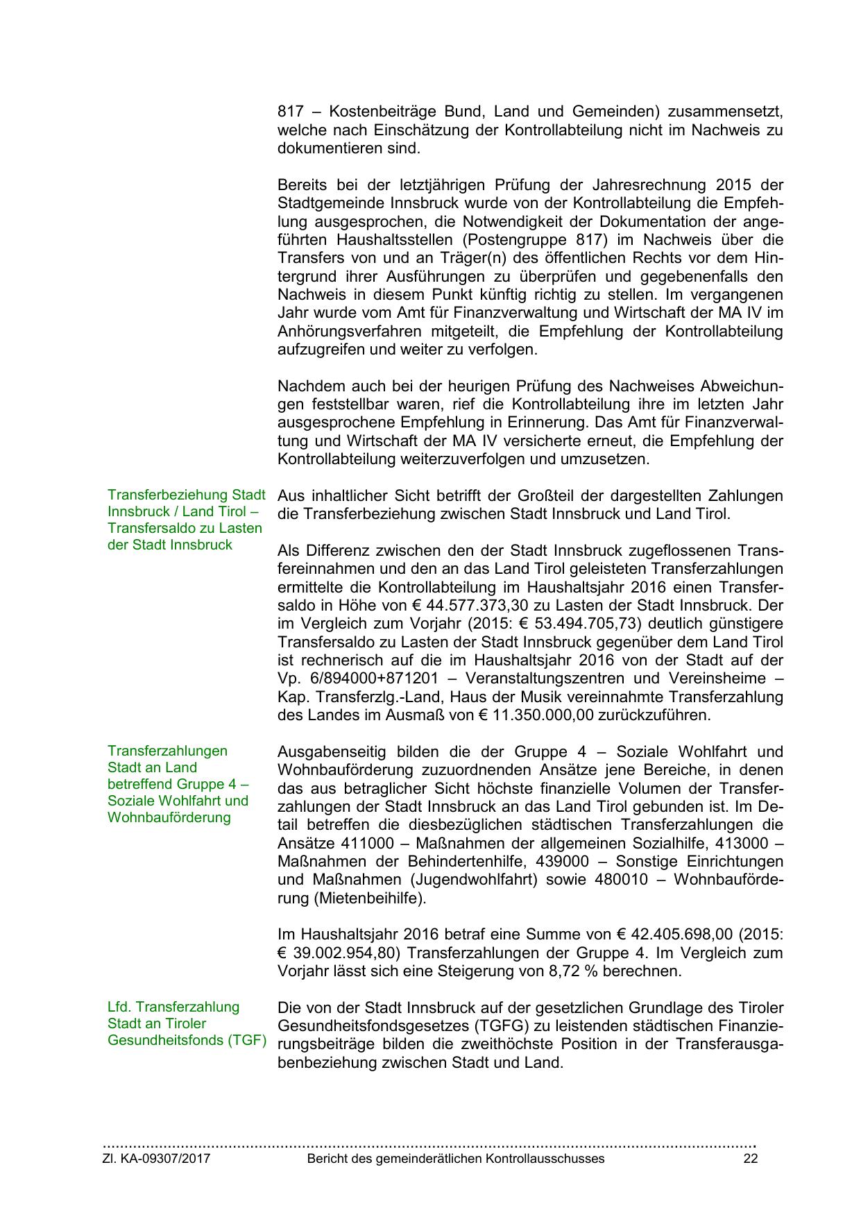 ermittelte die Kontrollabteilung im Haushaltsjahr 2016 einen Transfersaldo in Höhe von € 44.577.373,30 zu Lasten der Stadt Innsbruck. Der