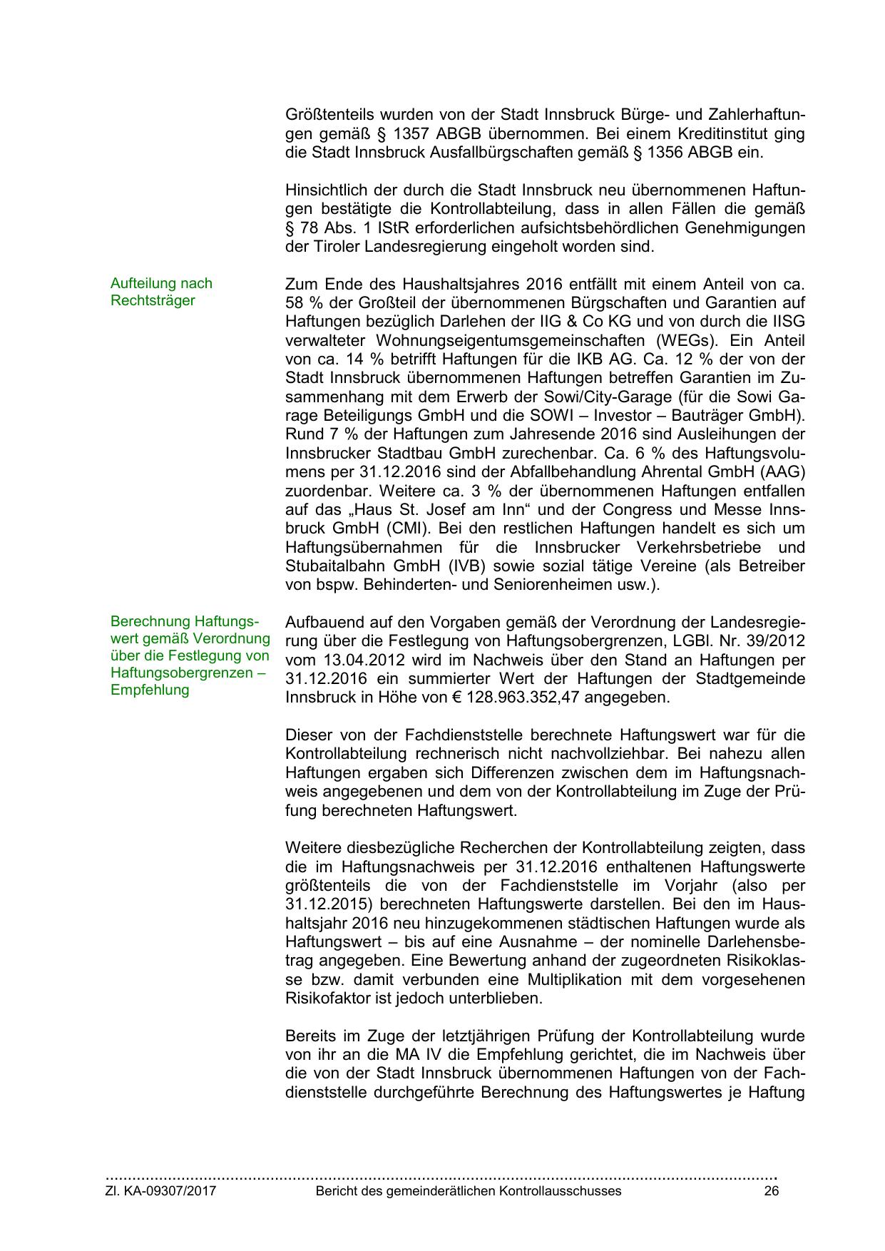 Hinsichtlich der durch die Stadt Innsbruck neu übernommenen Haftungen bestätigte die Kontrollabteilung, dass in allen Fällen die gemäß