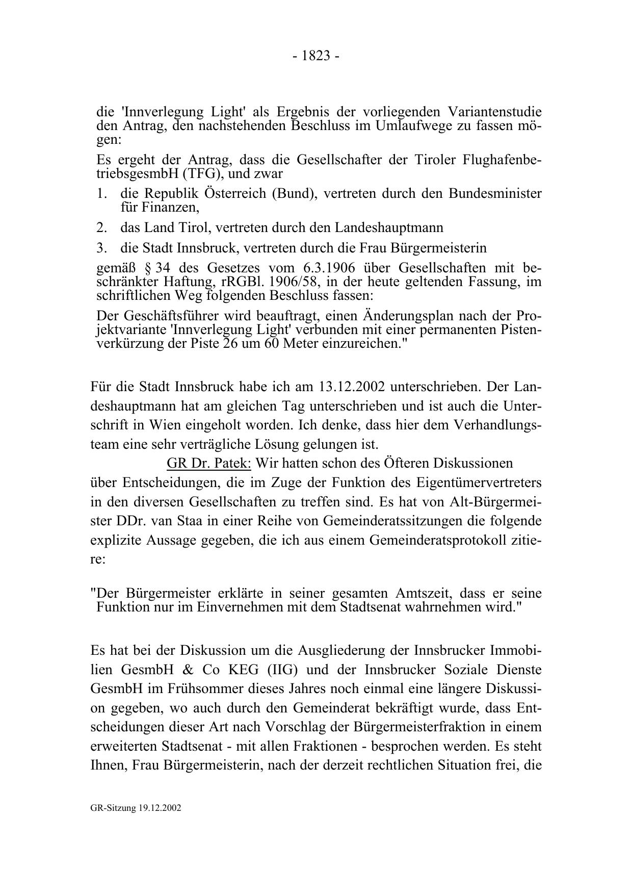 Für die Stadt Innsbruck habe ich am 13.12.2002 unterschrieben. Der Landeshauptmann hat am gleichen Tag unterschrieben und ist auch die Unterschrift in Wien eingeholt worden. Ich denke, dass hier dem Verhandlungsteam eine sehr verträgliche Lösung gelungen ist.