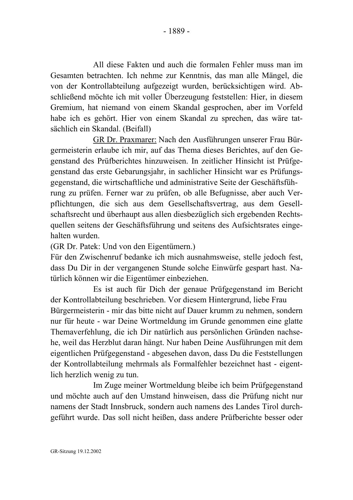 GR Dr. Praxmarer: Nach den Ausführungen unserer Frau Bürgermeisterin erlaube ich mir, auf das Thema dieses Berichtes, auf den Gegenstand des Prüfberichtes hinzuweisen. In zeitlicher Hinsicht ist Prüfgegenstand das erste Gebarungsjahr, in sachlicher Hinsicht war es Prüfungsgegenstand, die wirtschaftliche und administrative Seite der Geschäftsführung zu prüfen. Ferner war zu prüfen, ob alle Befugnisse, aber auch Verpflichtungen, die sich aus dem Gesellschaftsvertrag, aus dem Gesellschaftsrecht und überhaupt aus allen diesbezüglich sich ergebenden Rechtsquellen seitens der Geschäftsführung und seitens des Aufsichtsrates eingehalten wurden.
