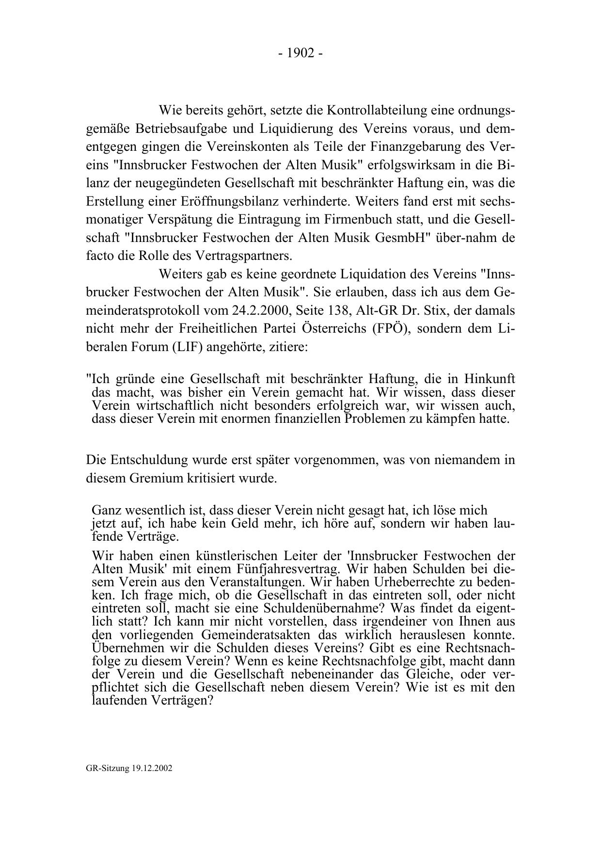 Weiters gab es keine geordnete Liquidation des Vereins "Innsbrucker Festwochen der Alten Musik". Sie erlauben, dass ich aus dem Gemeinderatsprotokoll vom 24.2.2000, Seite 138, Alt-GR Dr. Stix, der damals