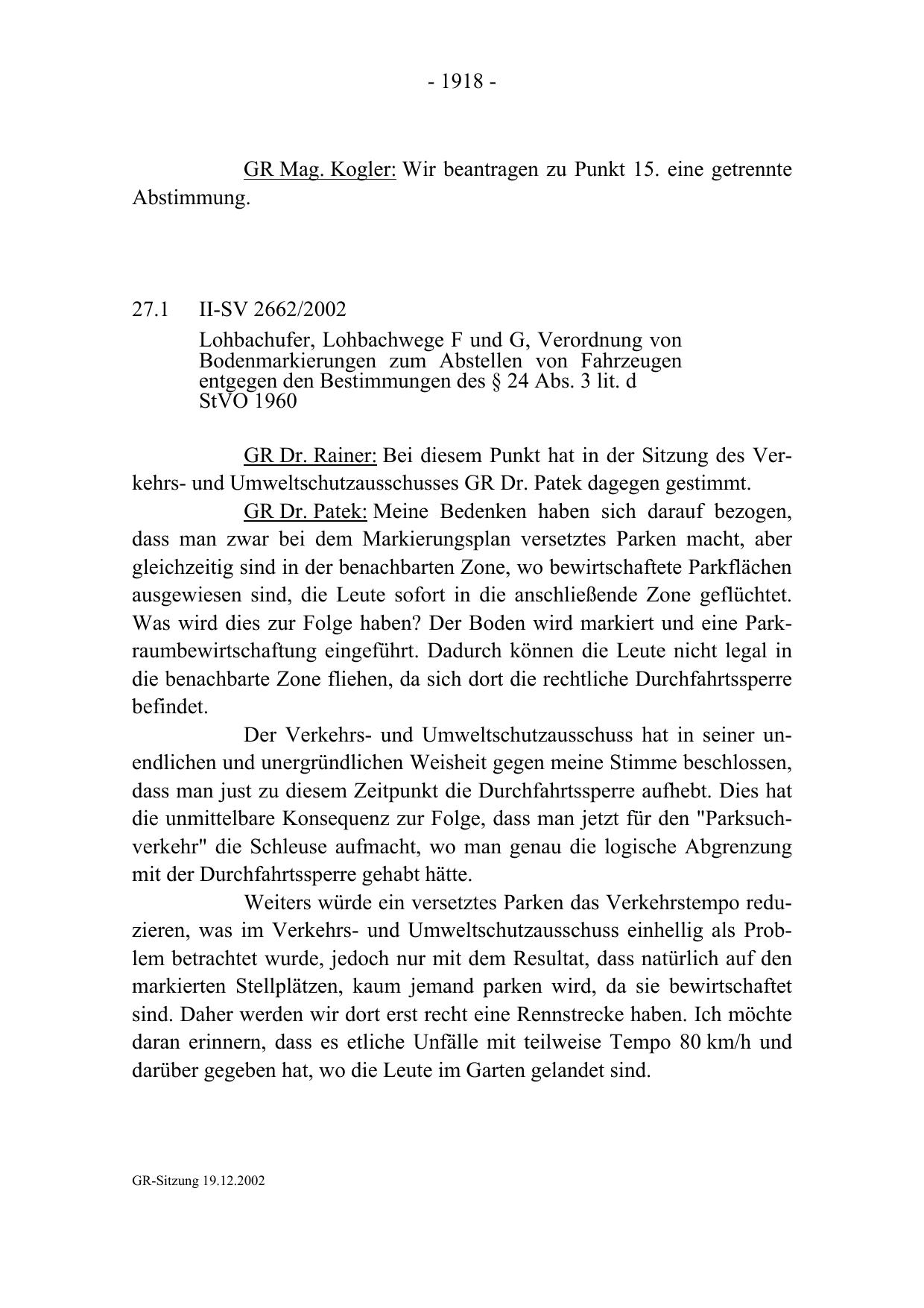 GR Dr. Rainer: Bei diesem Punkt hat in der Sitzung des Verkehrs- und Umweltschutzausschusses GR Dr. Patek dagegen gestimmt.