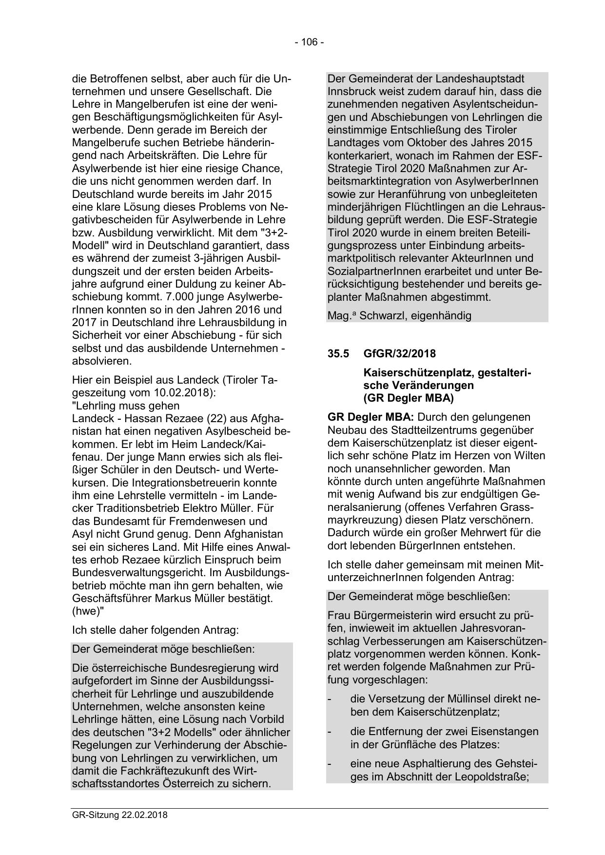 Frau Bürgermeisterin wird ersucht zu prüfen, inwieweit im aktuellen Jahresvoranschlag Verbesserungen am Kaiserschützenplatz vorgenommen werden können. Konkret werden folgende Maßnahmen zur Prüfung vorgeschlagen: