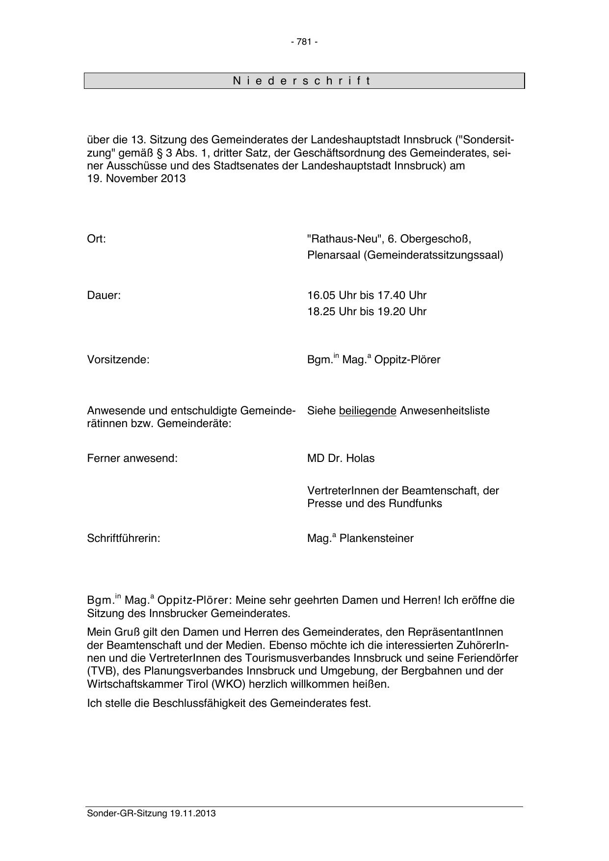 über die 13. Sitzung des Gemeinderates der Landeshauptstadt Innsbruck ("Sondersitzung" gemäß § 3 Abs. 1, dritter Satz, der Geschäftsordnung des Gemeinderates, seiner Ausschüsse und des Stadtsenates der Landeshauptstadt Innsbruck) am