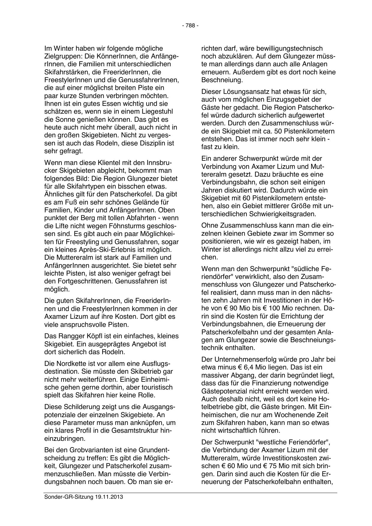 Bei den Grobvarianten ist eine Grundentscheidung zu treffen: Es gibt die Möglichkeit, Glungezer und Patscherkofel zusammenzuschließen. Man müsste die Verbindungsbahnen noch bauen. Ob man sie erSonder-GR-Sitzung 19.11.2013
