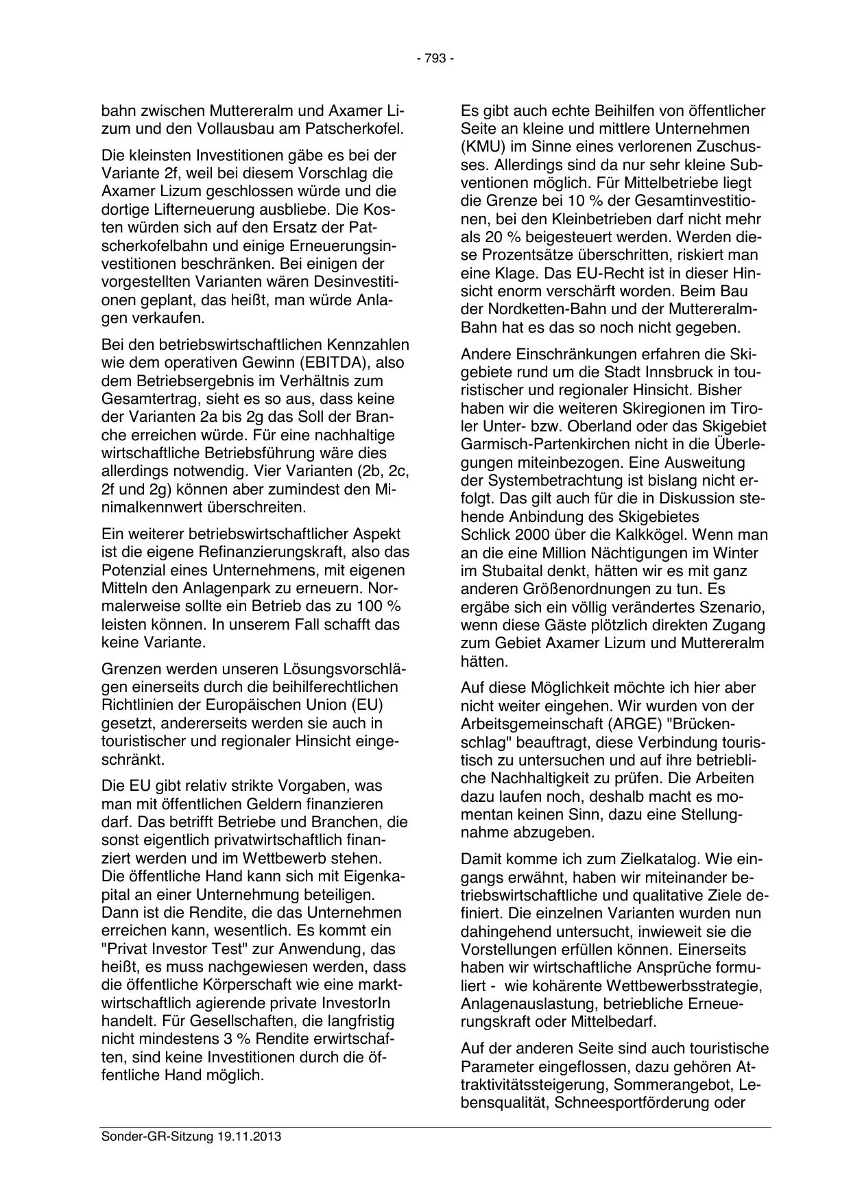 dortige Lifterneuerung ausbliebe. Die Kosten würden sich auf den Ersatz der Patscherkofelbahn und einige Erneuerungsinvestitionen beschränken. Bei einigen der