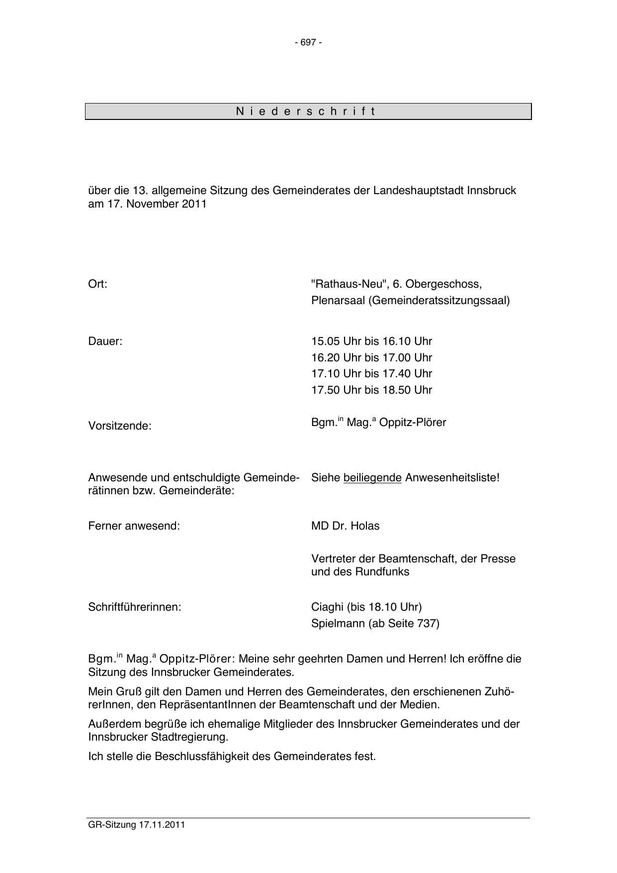Bgm.in Mag.a Oppitz-Plörer: Meine sehr geehrten Damen und Herren! Ich eröffne die