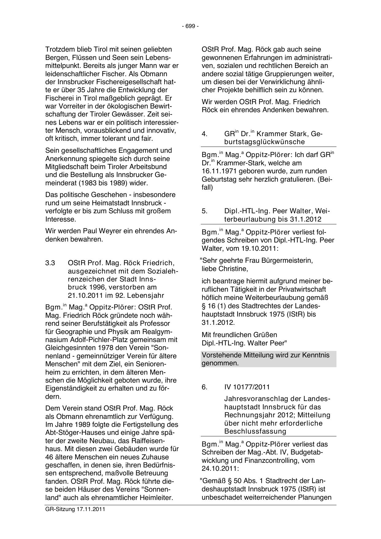 "Gemäß § 50 Abs. 1 Stadtrecht der Landeshauptstadt Innsbruck 1975 (IStR) ist