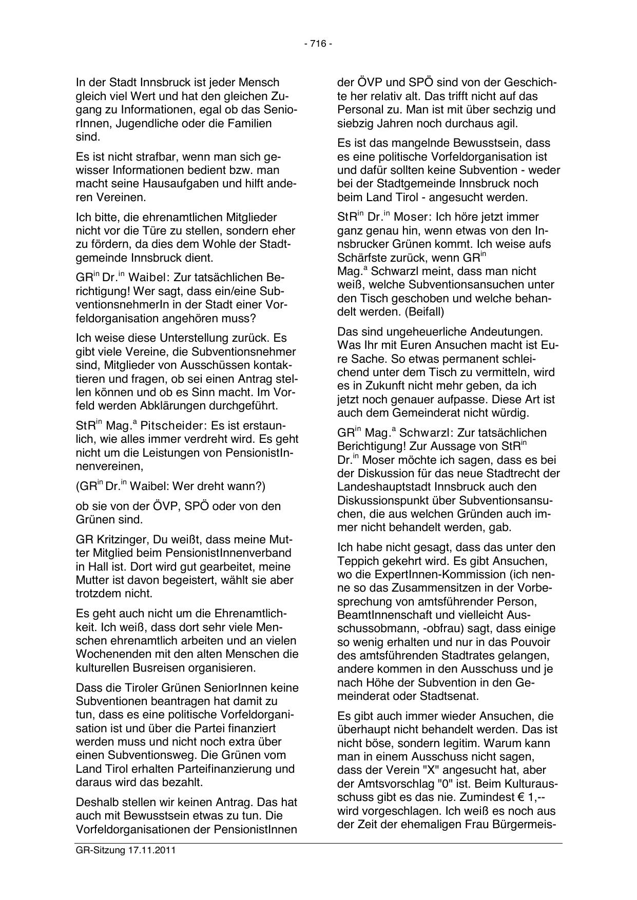 GRin Dr.in Waibel: Zur tatsächlichen Berichtigung! Wer sagt, dass ein/eine SubventionsnehmerIn in der Stadt einer Vorfeldorganisation angehören muss?
