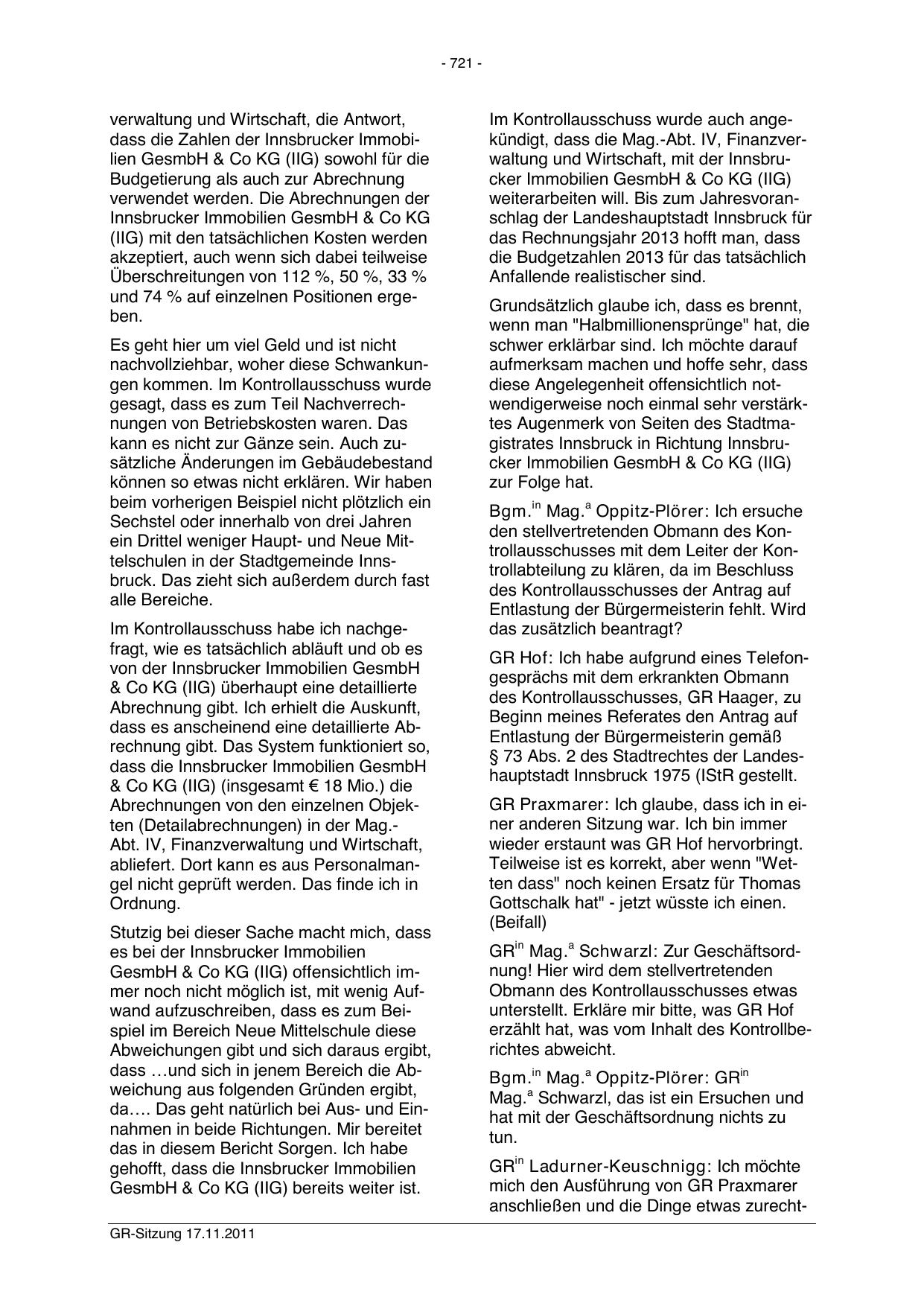 diese Angelegenheit offensichtlich notwendigerweise noch einmal sehr verstärktes Augenmerk von Seiten des Stadtmagistrates Innsbruck in Richtung Innsbrucker Immobilien GesmbH & Co KG (IIG)