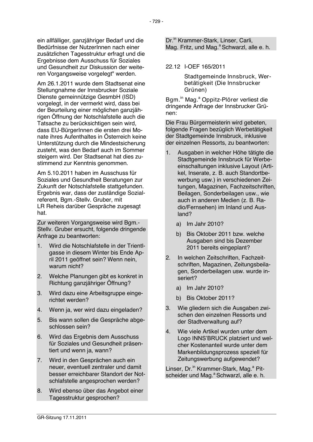 Am 26.1.2011 wurde dem Stadtsenat eine