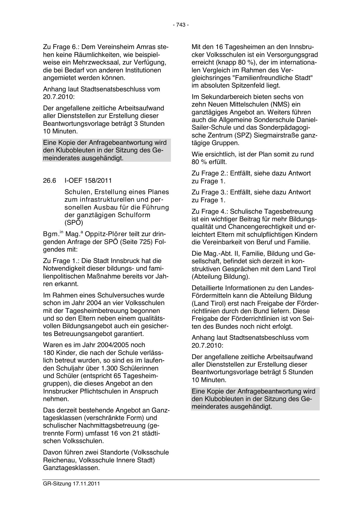 Bgm.in Mag.a Oppitz-Plörer teilt zur dringenden Anfrage der SPÖ (Seite 725) Folgendes mit: