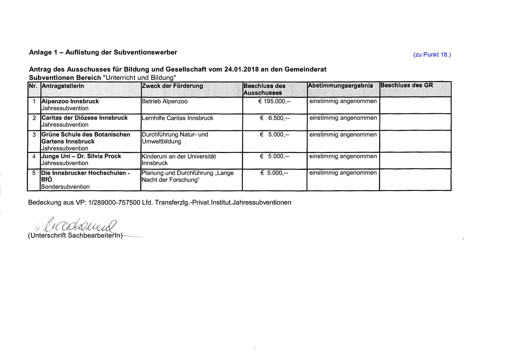 Bedeckung aus VP: 1/289000-757500 Lfd. Transferzlg.-Privat.lnstitut.Jahressubventionen