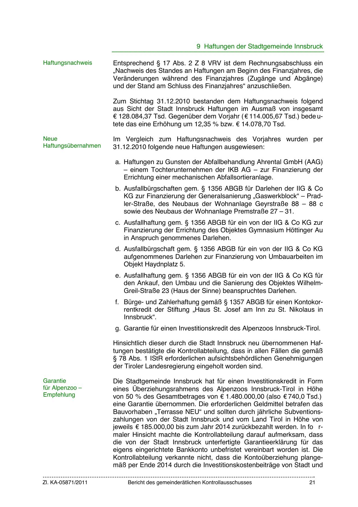 Hinsichtlich dieser durch die Stadt Innsbruck neu übernommenen Haftungen bestätigte die Kontrollabteilung, dass in allen Fällen die gemäß