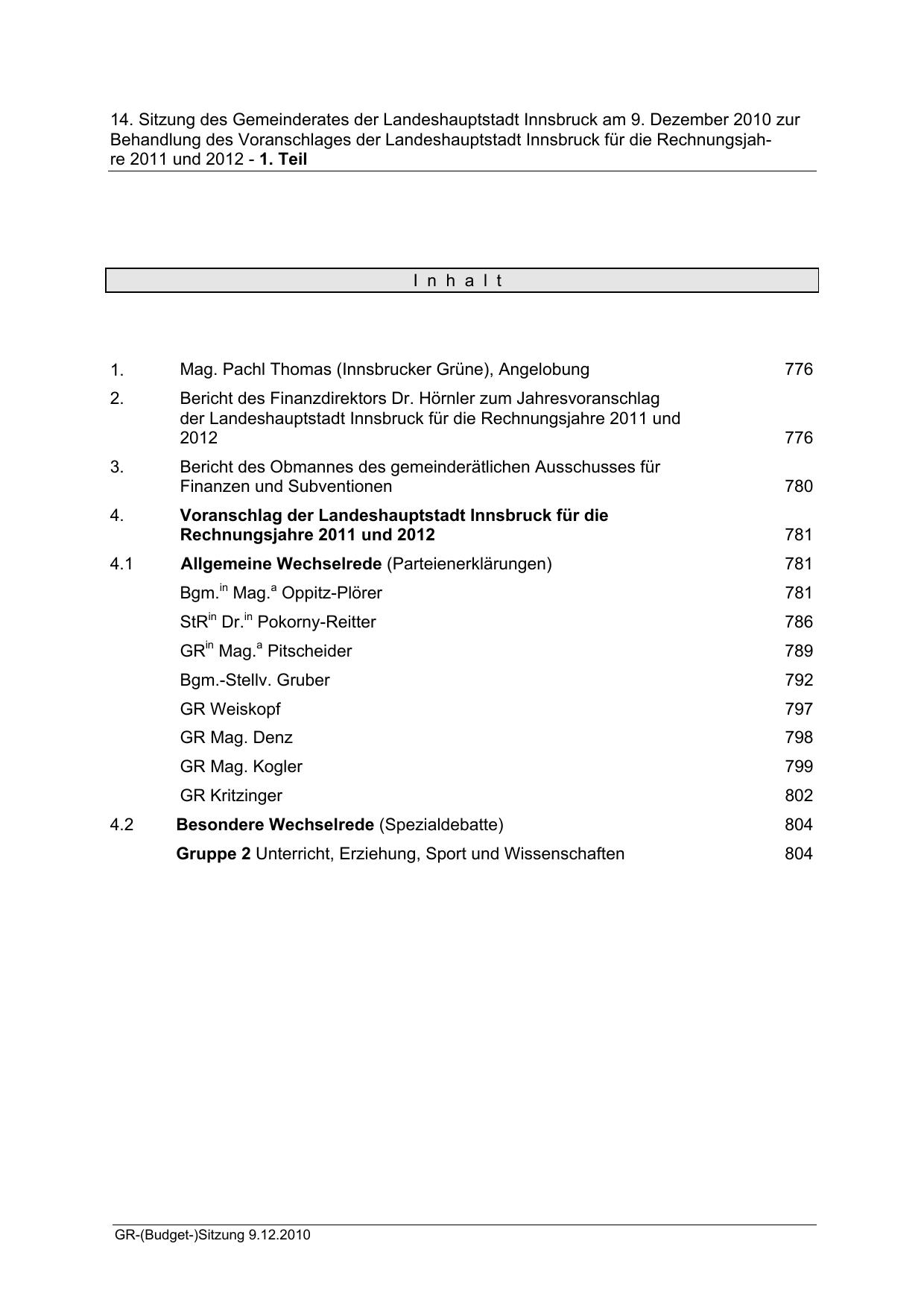 14. Sitzung des Gemeinderates der Landeshauptstadt Innsbruck am 9. Dezember 2010 zur