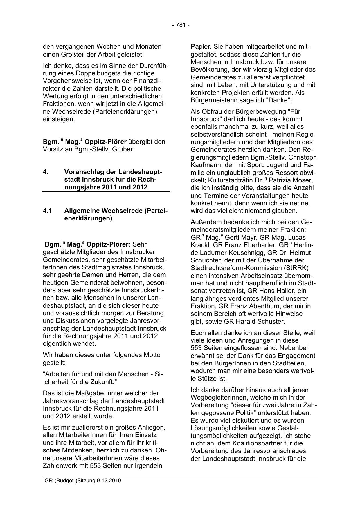 heutigen Gemeinderat beiwohnen, besonders aber sehr geschätzte InnsbruckerInnen bzw. alle Menschen in unserer Landeshauptstadt, an die sich dieser heute