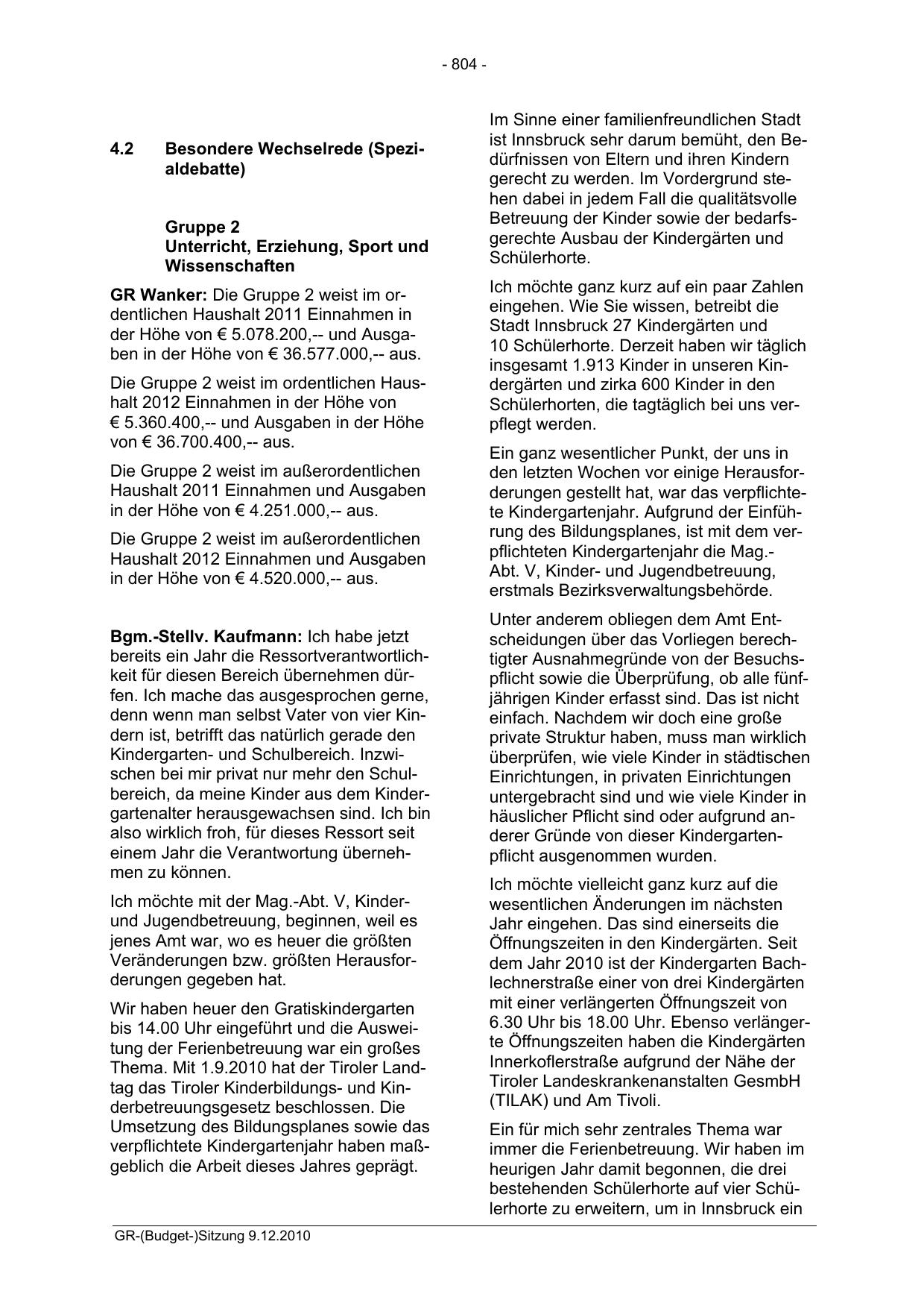 GR Wanker: Die Gruppe 2 weist im ordentlichen Haushalt 2011 Einnahmen in