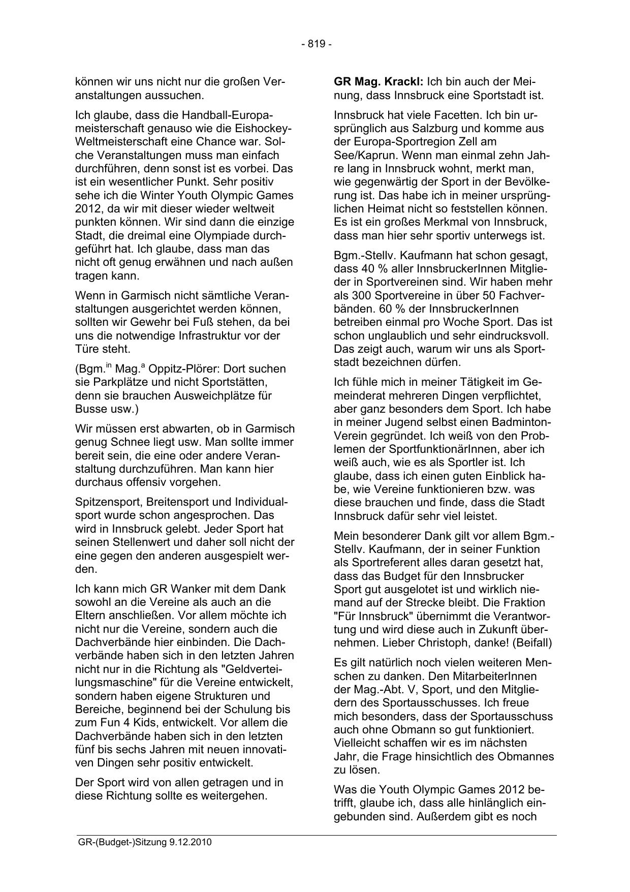 GR Mag. Krackl: Ich bin auch der Meinung, dass Innsbruck eine Sportstadt ist.